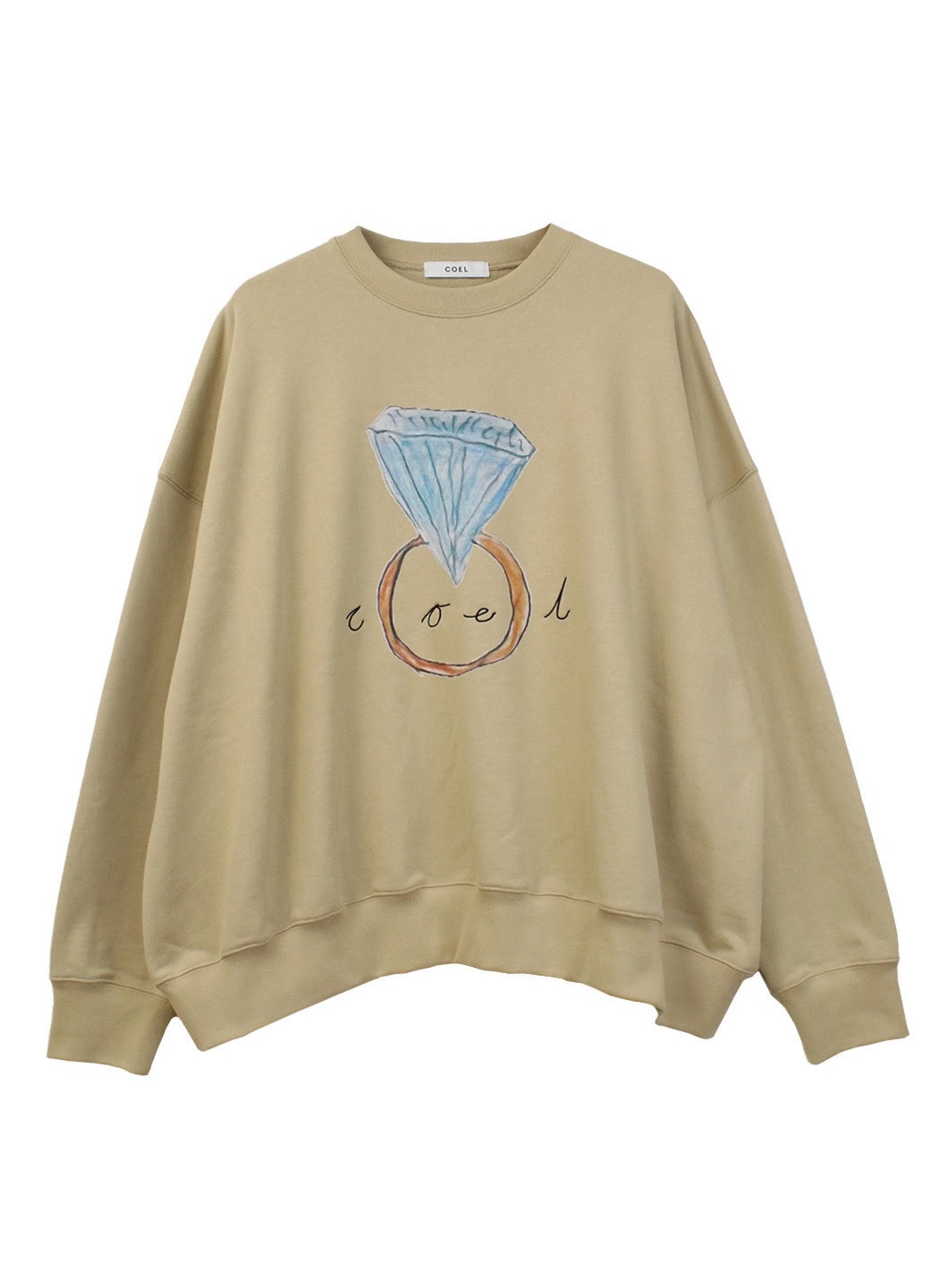 リングの中央にはCOELのロゴを繊細な刺繍で添え、さりげないラグジュアリーを表現。カラーはグレーとベージュの2色。柔らかな風合いとリラックス感のあるオーバーサイズシルエットが、遊び心と上質さを見事に共存させています。