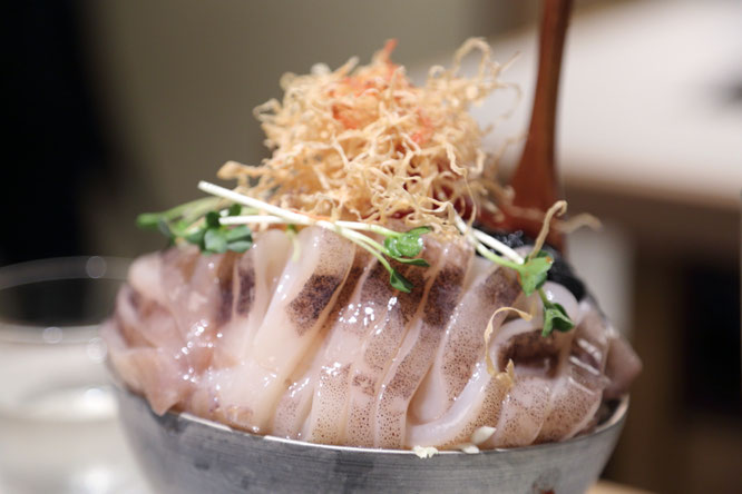 壱:(出汁)鹿児島黒豚、鶏ガラ、鯖節、うるめ節、かたくちいわしの煮干し、昆布、野菜など十種の具材を五時間かけて煮込み、富士山源流水で仕上げた“白い出汁”。透き通るような白色が印象的で、やさしい旨味が口いっぱいに広がります。