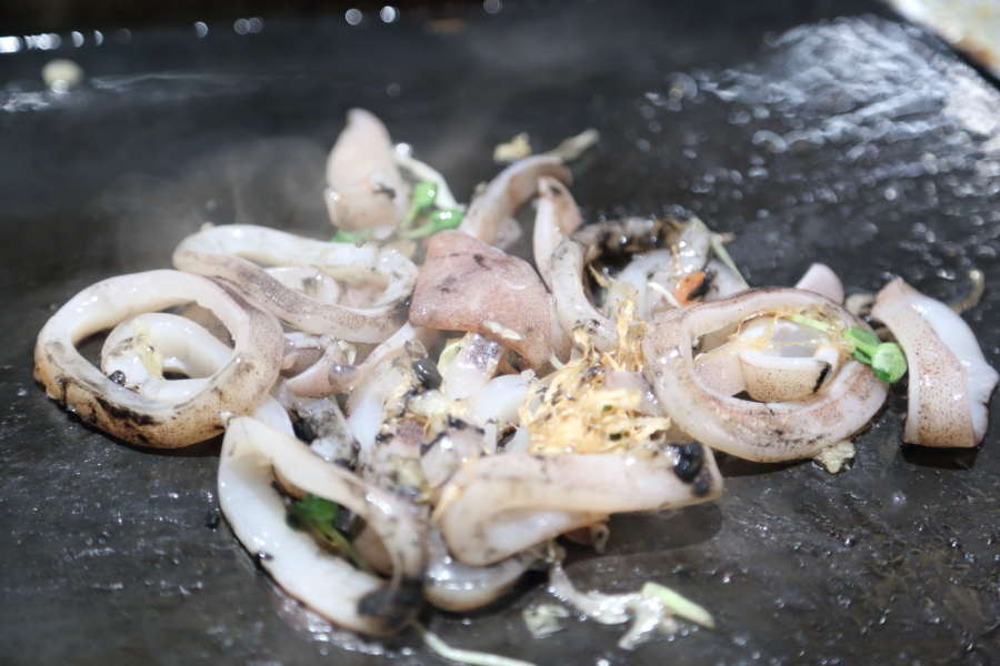 豊洲直送つぼいかを使った、いか墨バター仕立てのもんじゃ。イカは店員さんが目の前で小さく切ってくれ、食べやすく、また、トマトの酸味が加わることで、まるでイタリアンのような上品さを感じる一品でした。
