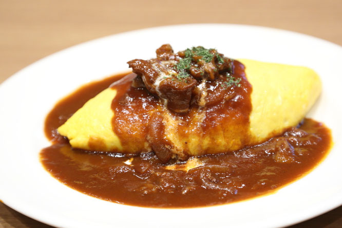 香ばしいチキンライスをふんわり卵で包み、じっくり煮込んだビーフと野菜の旨味が溶け合う、